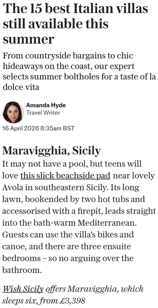 Thanks to the Telegraph for including us in an article on the 15 best Italian villas still available this summer. One of the newest arrivals to our collection, Maravigghia is a stylish villa for six, with direct access to the sea, close to Avola in southeast Sicily. As demand for the peak season weeks increase, finding the perfect villa on specific dates can be problematic, but as a relatively recent addition to the Wish Sicily portfolio, Maravigghia still has good availability in July and August. Alternatively, get great value for money by snapping up a week in June.