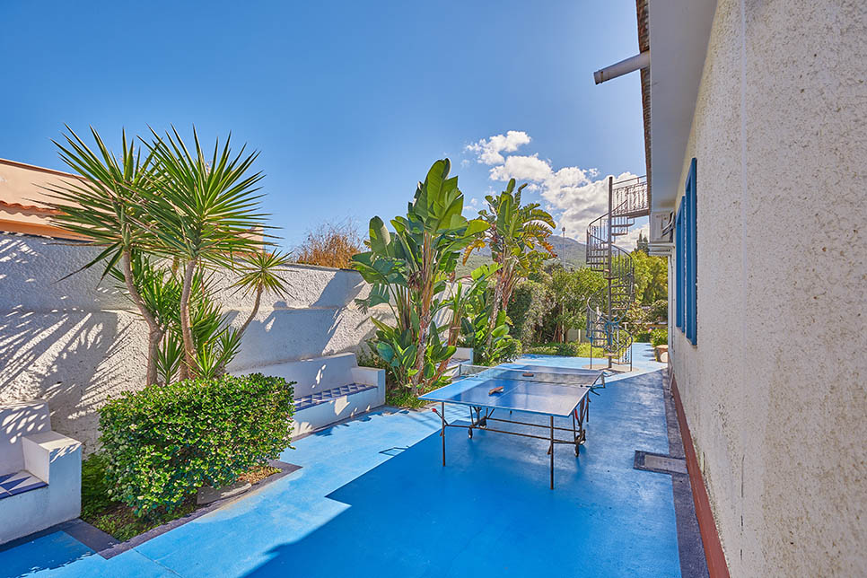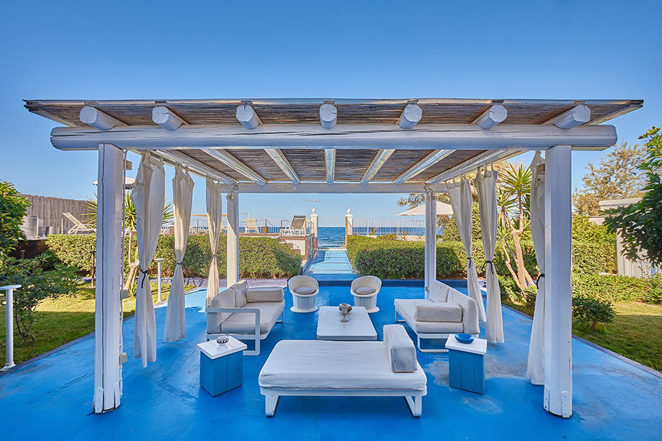 A walkway leads down from the villa, through mature gardens, to an elegant decked pool area, and beyond that, directly on to the pebbly beach. The pool has been recently renovated with a cutting-edge swimming pool basin, a relaxation area, and an elegant dark grey PVC cover that adds a touch of exclusivity. The villa’s outdoor space is cleverly divided into several ‘rooms’, including a veranda with lounge-style seating, a decked dining area close to the gate to the beach and, right on the beach, but for the exclusive use of the villa’s guests, a decked and furnished patio – perfect for that chilled aperitif at sunset!