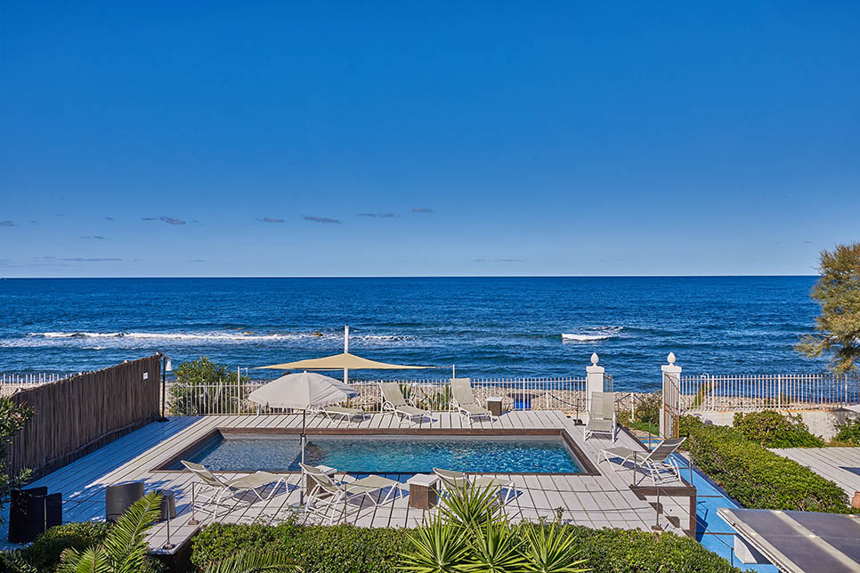 Seafront villa near Cefalù with direct beach access, saltwater pool, spacious outdoor areas, modern interiors, BBQ, four double bedrooms, a twin, and four bathrooms.
