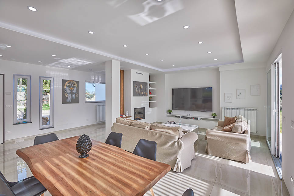 Gli interni sono luminosi, ariosi e curati con gusto, perfetti per la vita in famiglia. I pavimenti chiari e le pareti bianche, arricchite da dettagli di arte contemporanea, creano ambienti eleganti e rilassanti. Le porte-finestre collegano il giardino al soggiorno open space, che include un’area salotto con camino e una zona pranzo. La cucina è completamente attrezzata e dispone di una grande isola utilizzabile anche come pratico piano colazione.
