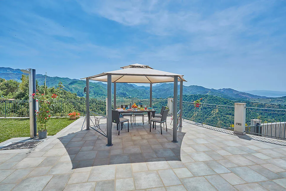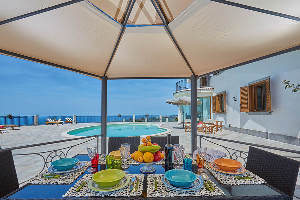 La villa è circondata da un giardino e terrazze pavimentate, con una grande piscina a forma ovale e una vista mozzafiato su tutta la costa. Accanto alla piscina, un grazioso gazebo offre il posto ideale per cenare all’aperto ammirando l’incantevole scenario circostante, a metà tra le verdeggianti montagne dei Peloritani e l’azzurro del mar Tirreno.